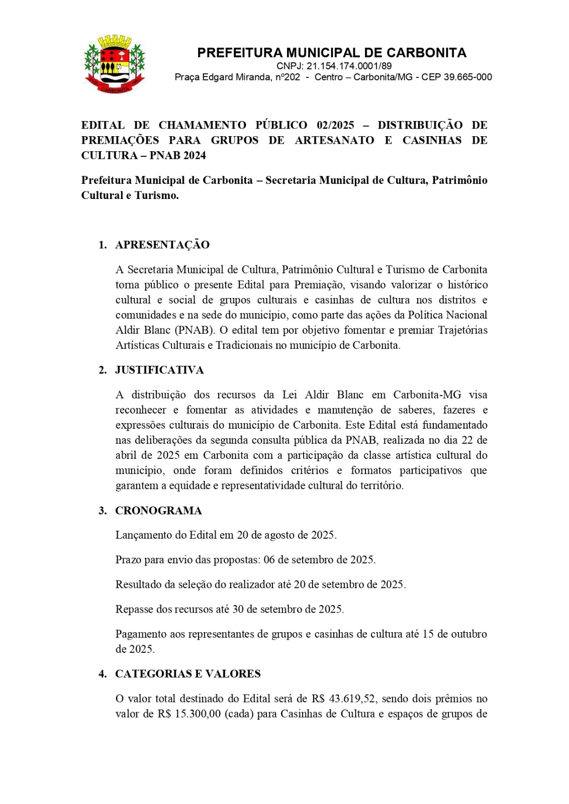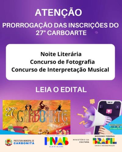 A Secretaria Municipal de Cultura, Patrimônio Cultural e Turismo de Carbonita torna público o presente Edital para Premiação, visando valorizar o histórico cultural e social de grupos culturais e casinhas de cultura nos distritos e comunidades e na sede do município, como parte das ações da Política Nacional Aldir Blanc (PNAB). O edital tem por objetivo fomentar e premiar Trajetórias Artísticas Culturais e Tradicionais no município de Carbonita.