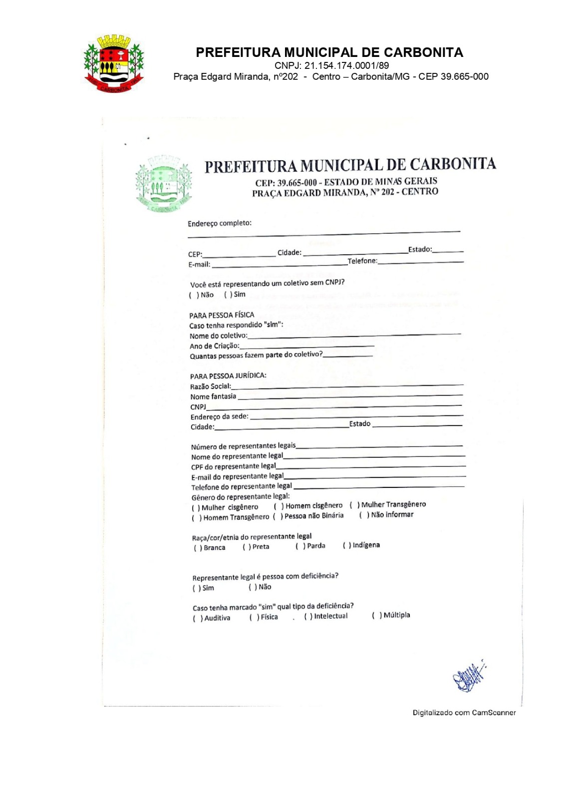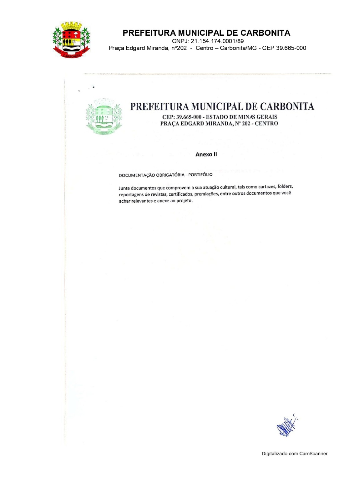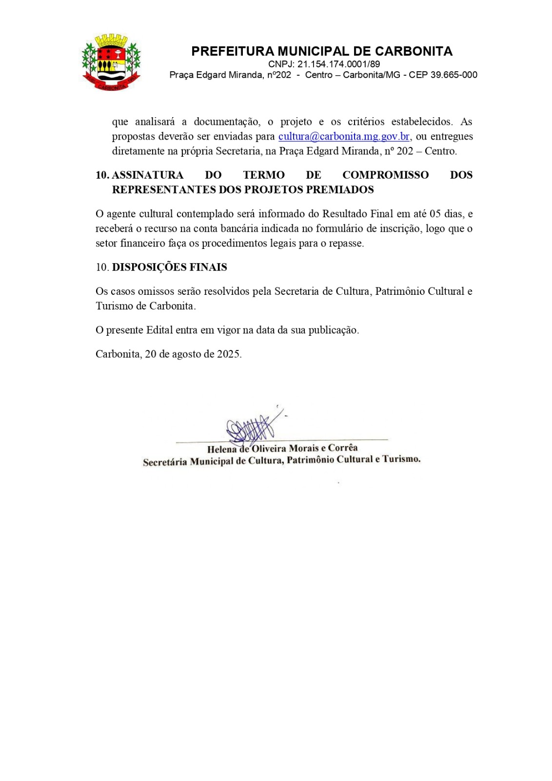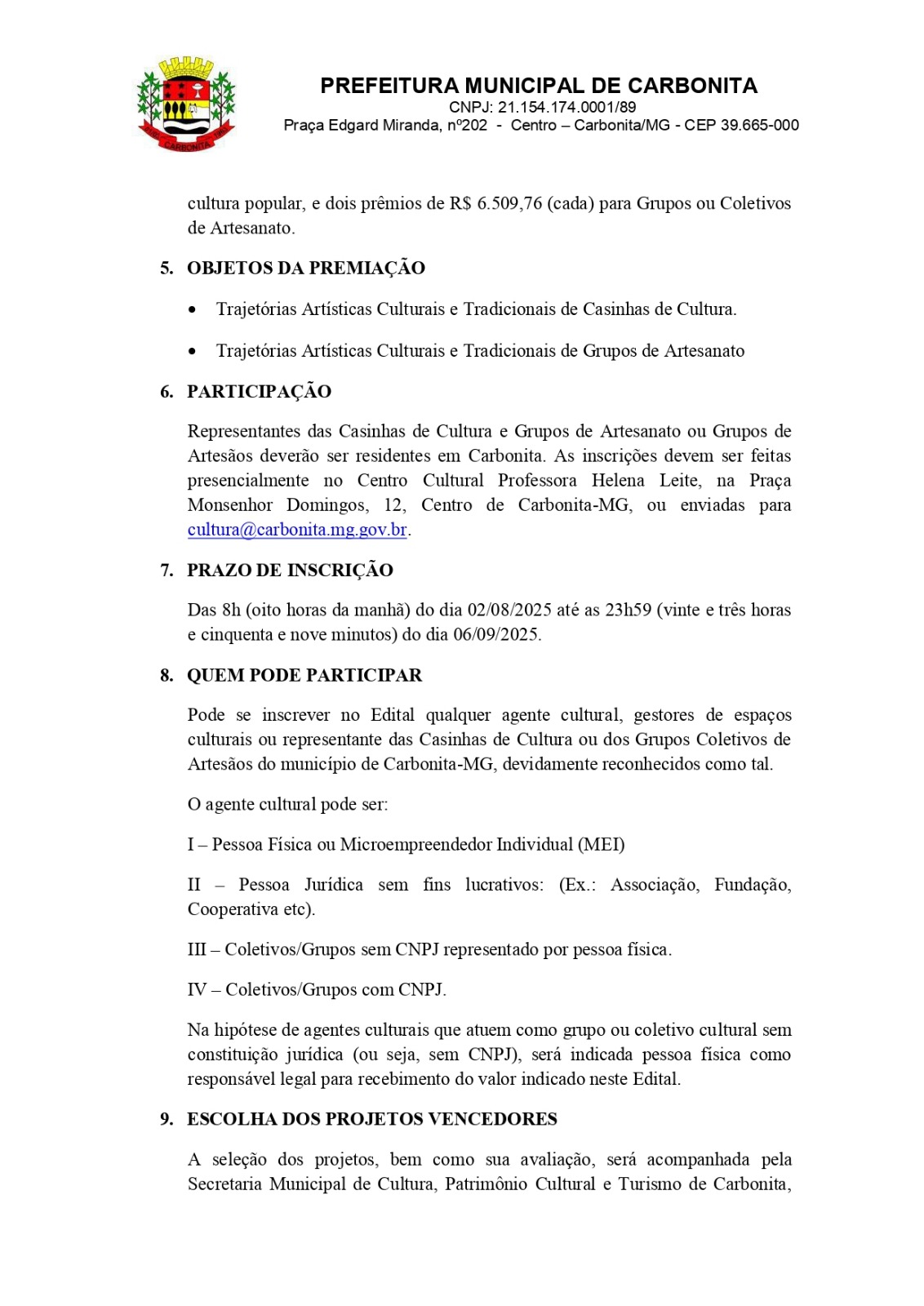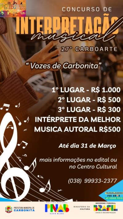 Prefeitura Municipal de Carbonita – Secretaria Municipal de Cultura, Patrimônio Cultural e Turismo.
