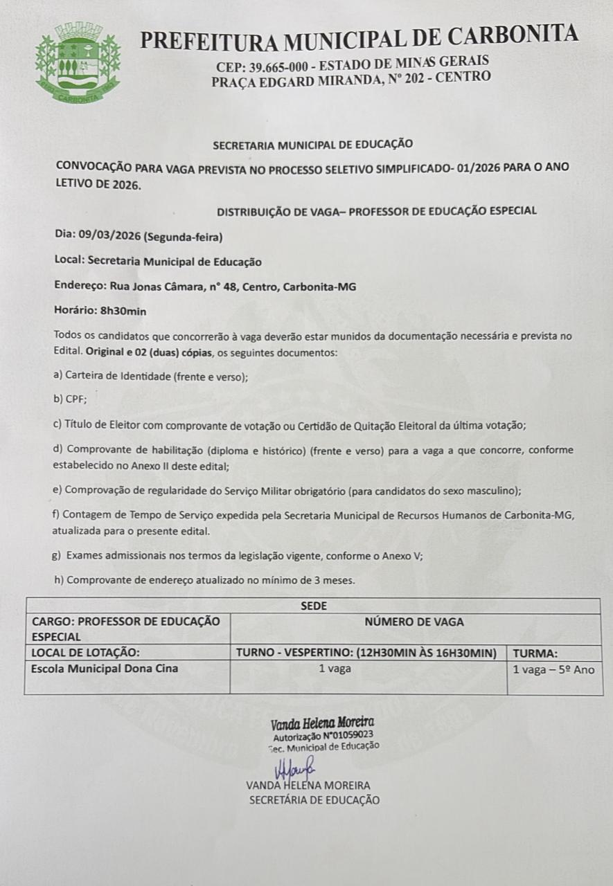 Convocação Vaga temporário Professor Educação Especial