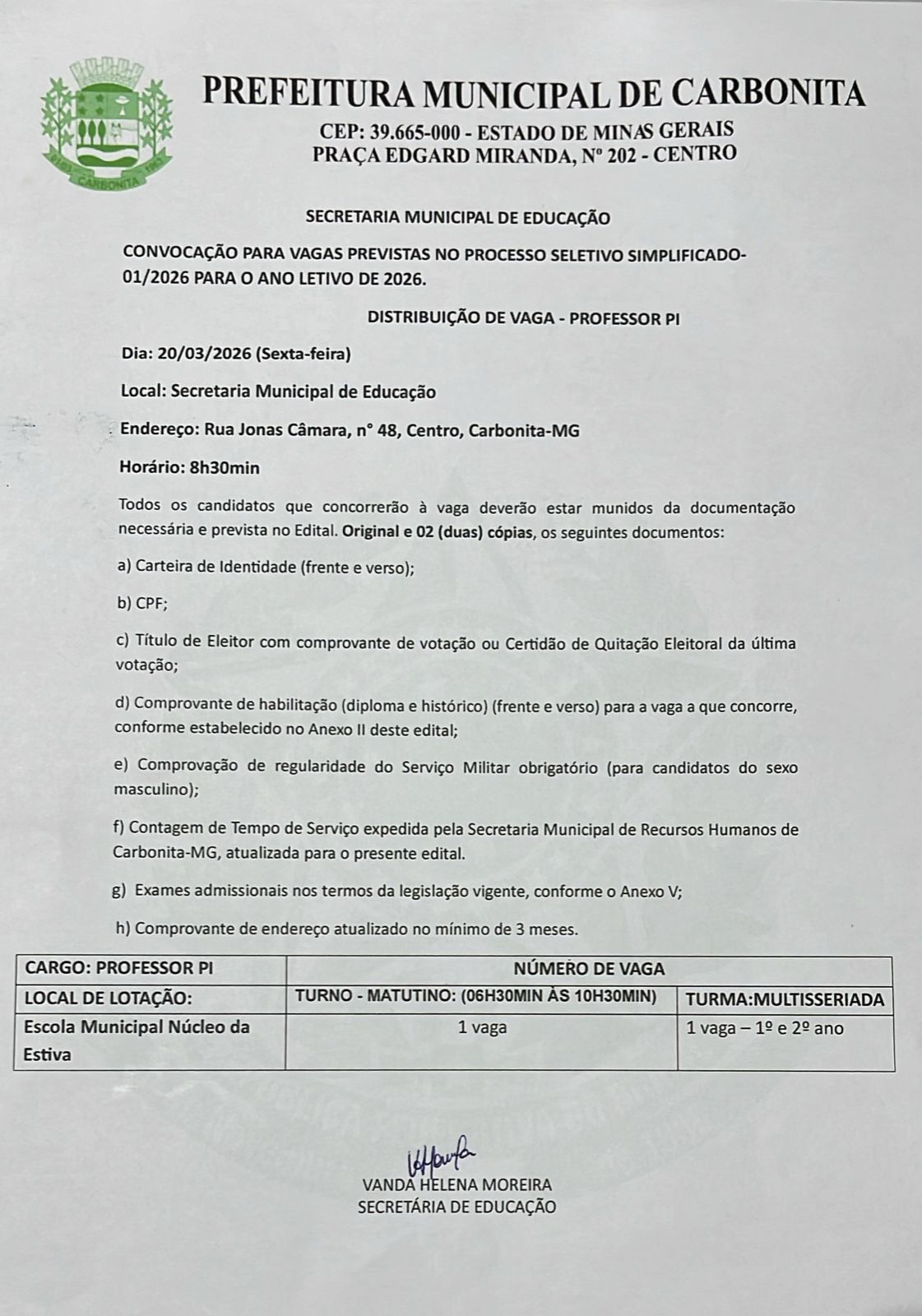 Confira o as vagas disponiveis para a convocação do processo seletivo simplificado nº 01/2026